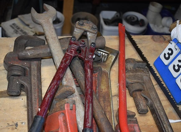 Lot of pipe wrenches, bow saw, bolt cutters, etc.