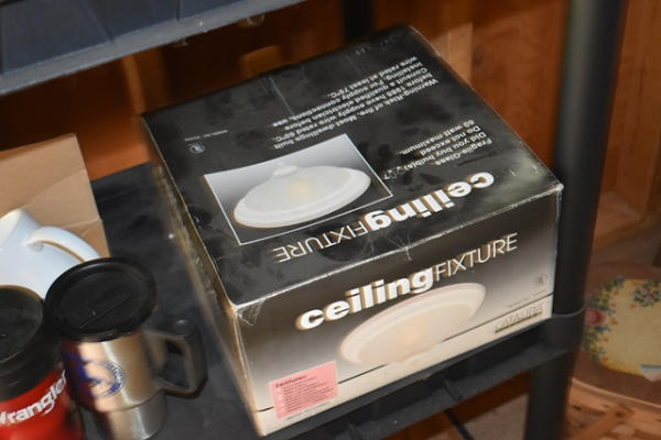 Shelf lot including "Jesus The Story Book Bible", cups, ceiling fixture, etc.