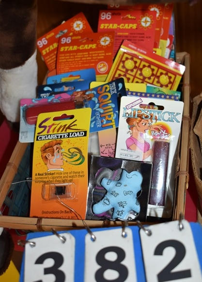 Box lot including cigarette loads, caps, trick lighters, etc.