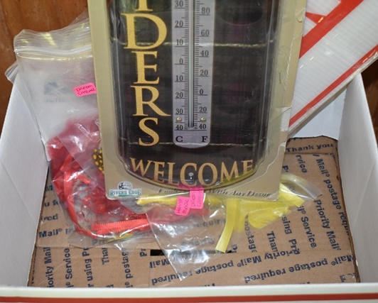 Box lot including gloves, horse thermometer, open house signs, etc.