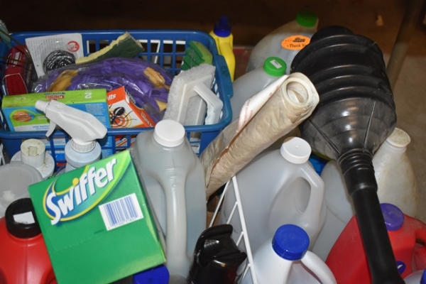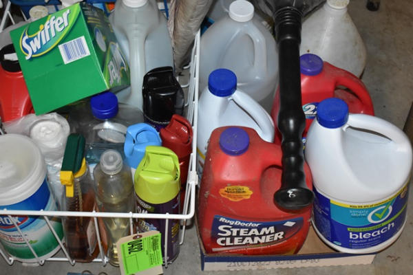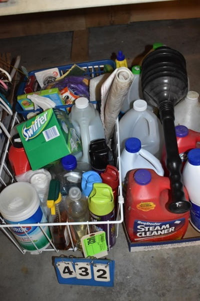 Large lot of cleaning supplies including carpet cleaner, Swifter items, etc.