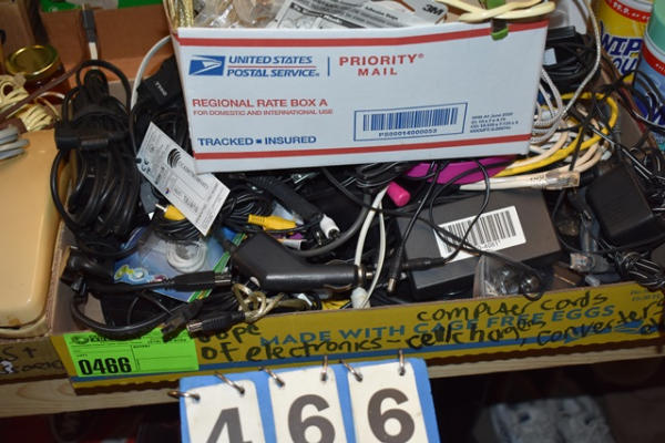 Box lot with computer cords, charging cords, AC cords, etc., approx. 68 +/- cords