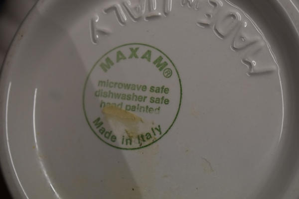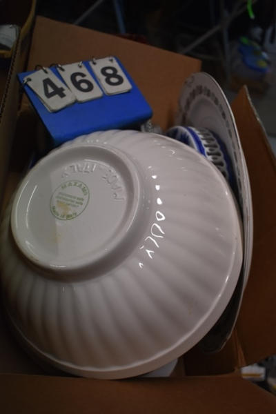 Box lot including cake tray, 2 crock servers, platter by Silver Wreath, Japan, bowl by Maxam, made it Italy, and 1 silver with crystal server dish
