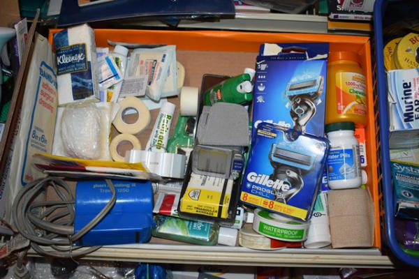 Lot of bathroom toiletries including toilet paper, vitamins, air freshener, razors