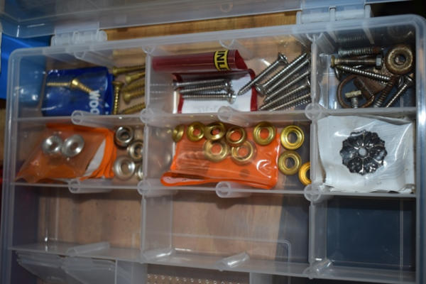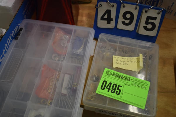 Lot of 2 organizing bins with Chicago screws, grommets, bolts, etc.