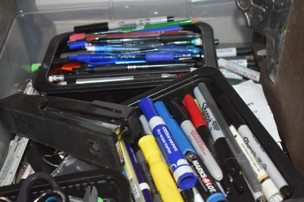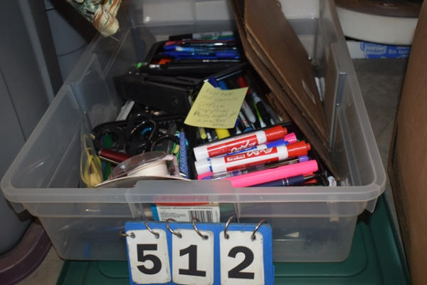 Bin of office supplies including Dry Erase Pens, markers, pens, scissors, etc.
