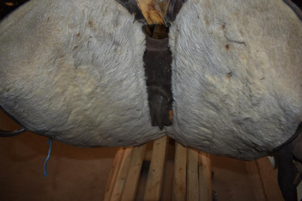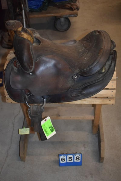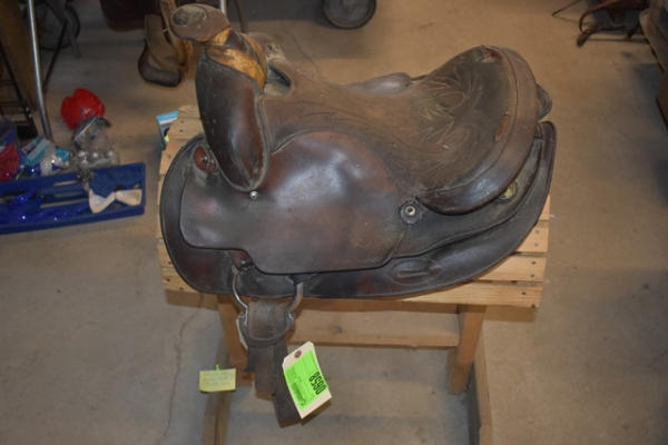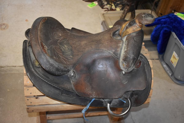 Saddle, leather wrapped horn, suede seat, no fenders or stirrups, 16" seat, 7" gullet