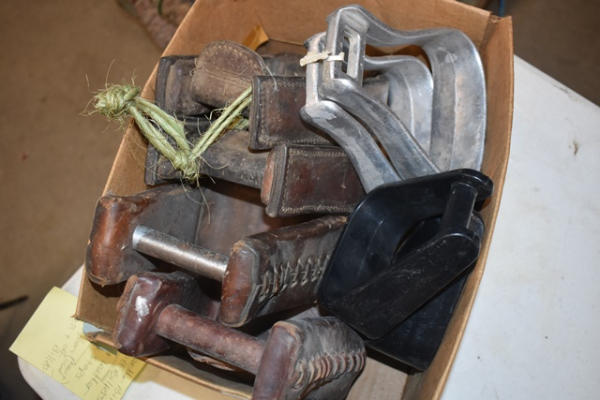 1 pair of brushed aluminum show stirrups and 1 pair tooled leather stirrups, 1 pair of leather stitched and 1 pair of kids plastic stirrups
