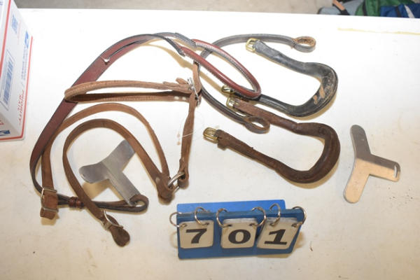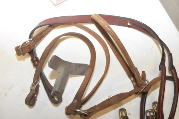 Pony crupper with strap for riding saddle, 1 aluminum saddle attachment, 1 brown brow band, 1 tail crupper with split leather for training surcingle and 2 leather driving cruppers