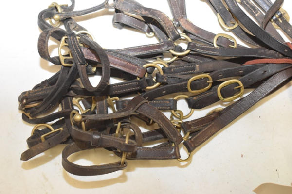 Lot of 9 B mini or foal size leather halters, size 1, adjustable nose and crown