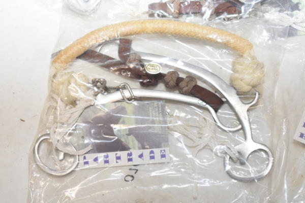 Stainless steel brushed chuck hackamore with rawhide braided rope noseband, 8 1/4" cheeks with silver trim, complete with leather curb connector and dog curve chain for intermediate horse, medium to strong effect