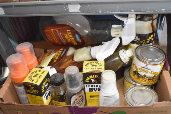 Lot consisting of Leather Dye, Fiebings Oil, Saddle Soap, etc. (SEE LAST PHOTO FOR DETAILED LIST)