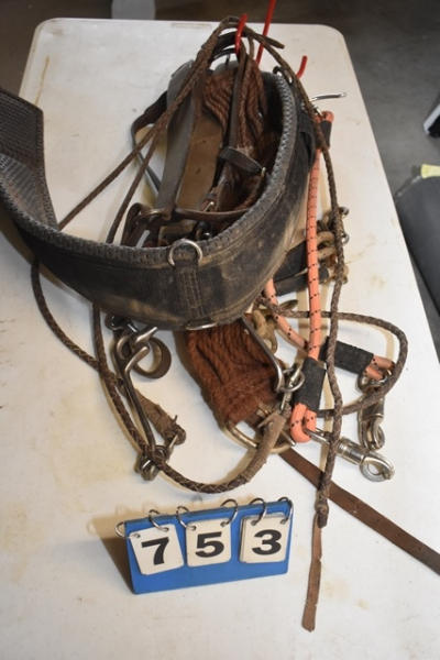 Tack hook lot including plain design breast collars (size 44), Tuffy neoprene western girth, rolled bridle, long shank bit, pair of trailer ties, string girth and off billet