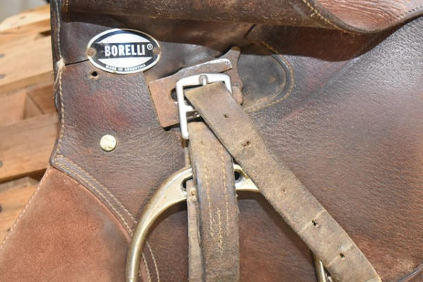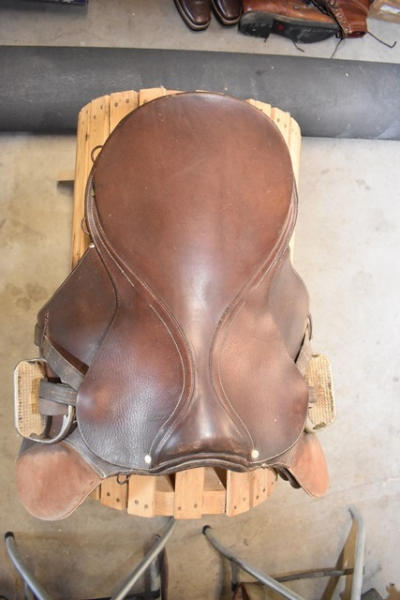 Wide tree, Borelli, Made in Argentina, English saddle, Model 6677, with outside suede knee rolls, inside pencil Rolls, with back leg block, 17"
