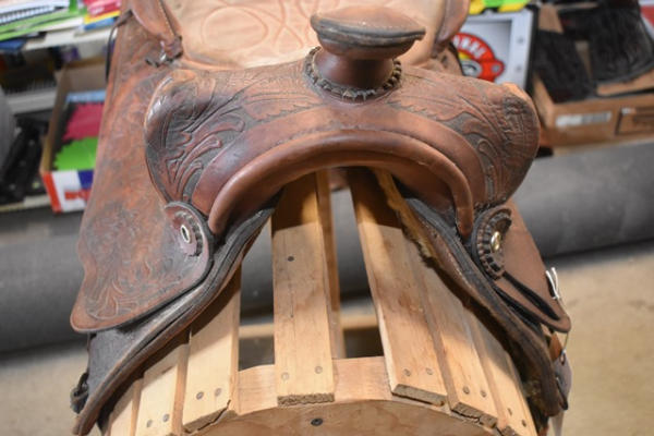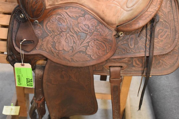 Saddle, Floral tooled with horse head fenders and 15" seat, 7" gullet, includes matching back straps