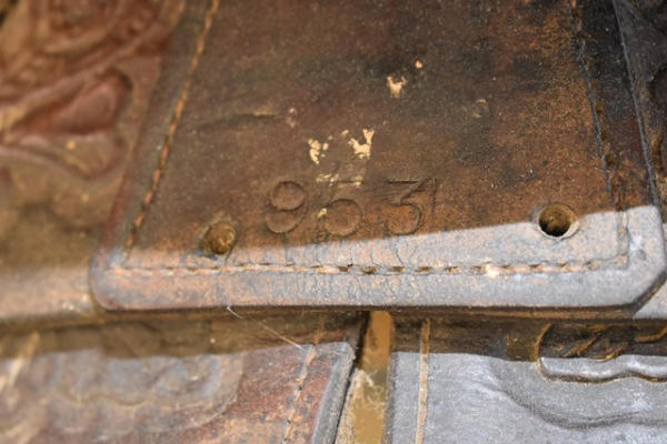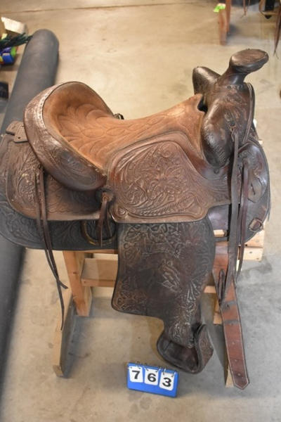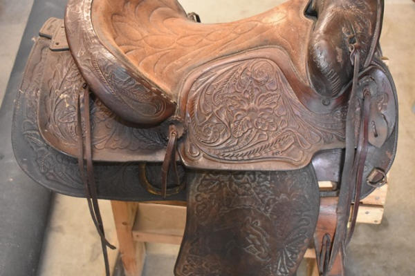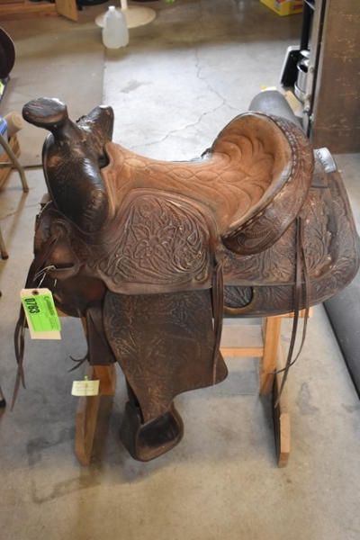 Saddle, 16" tooled suede seat, with horse head and fenders, hard to find matching horse head, stirrups, 7 1/2" gullet and folding saddle rack
