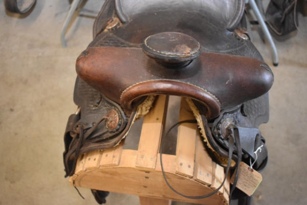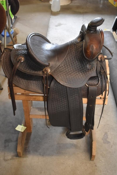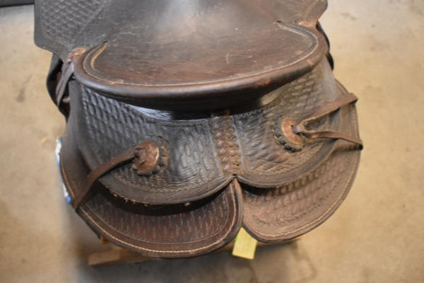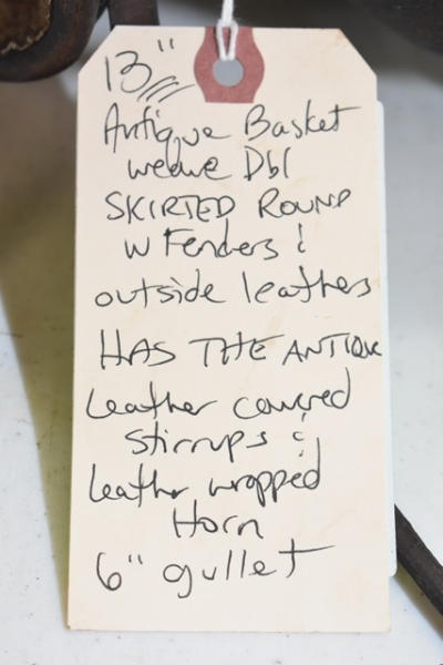 Saddle with antique basketweave double skirted round with fenders and outside leathers, has the antique leather carved stirrups, leather wrapped horn, 13" seat with 6" gullet
