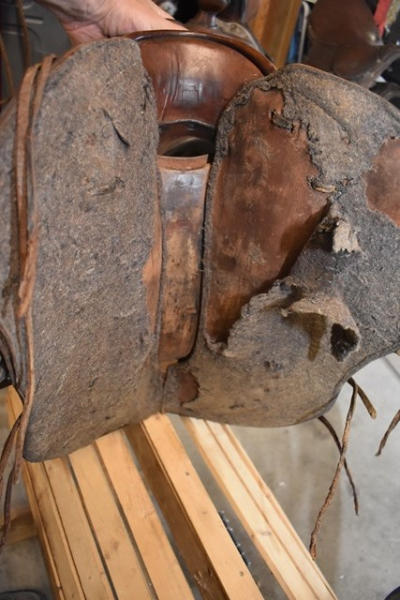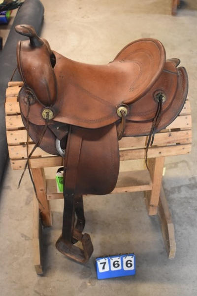 Saddle, 14" antique brown, kids/small adult saddle, with rounded skirts, wooden stirrups, high swell with 5 1/2" gullet