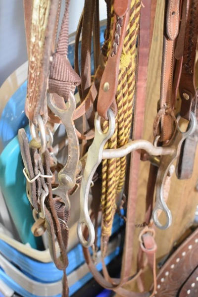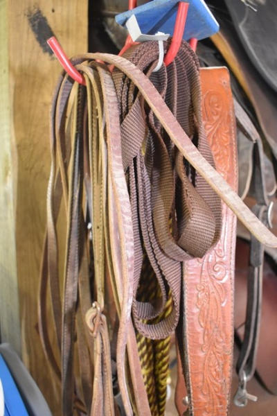Tack hook lot including fancy tooled breast collars, snap on bit with reins (converts halter to a bridle), leather 1 ear split rein bridle, string girth, 1 ear with aluminum bit, 1 ear with split reins