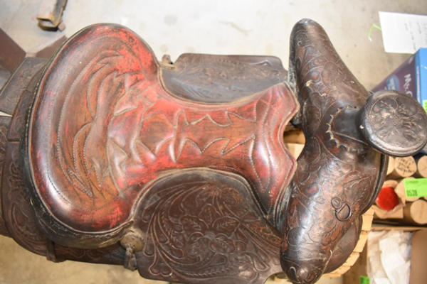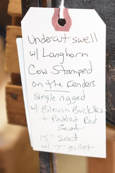Under Cut Swell with long horn cow stamped on fenders, single rig with leather buckles and padded red seat, 15" seat, 7" gullet