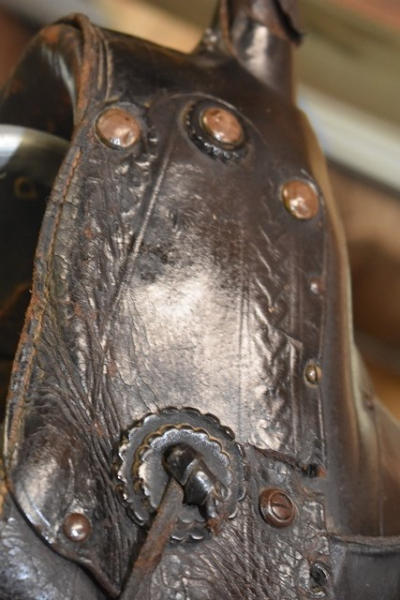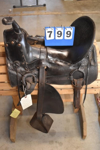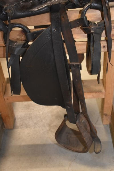 1930 Open gullet, 14" seat, high back spotted saddle, with wide wooden stirrups, double rigged, 5" gullet