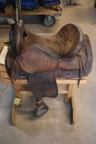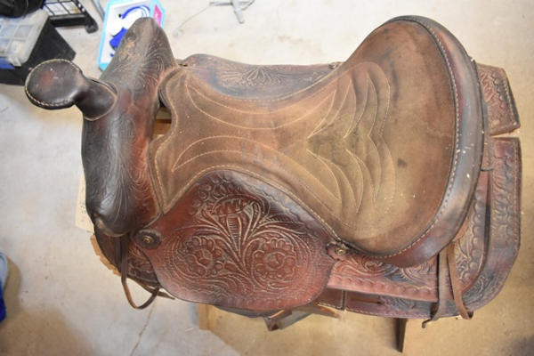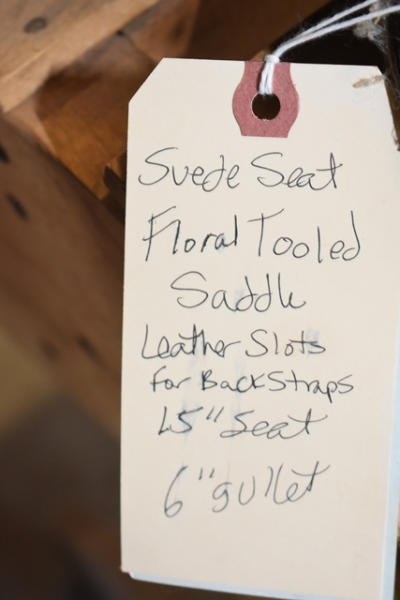 Suede seat, floral tooled saddle, leather slot for back strap, 15" seat, 6" gullet