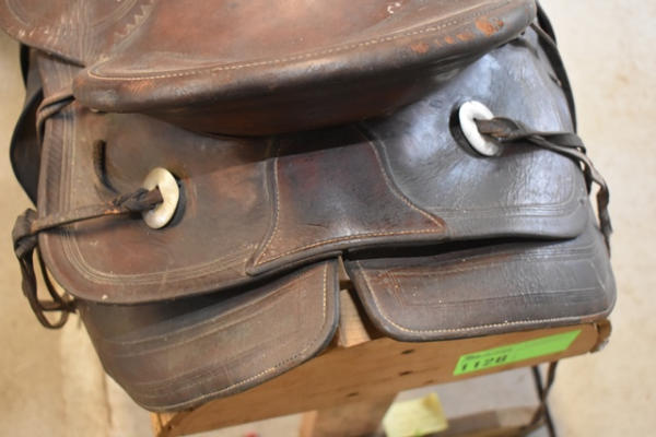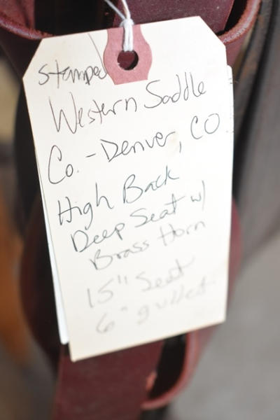 Western Saddle Company, Denver, CO, high back, deep seat with brass horn, 15" seat, 6" gullet, outside stirrup fenders and round stirrups