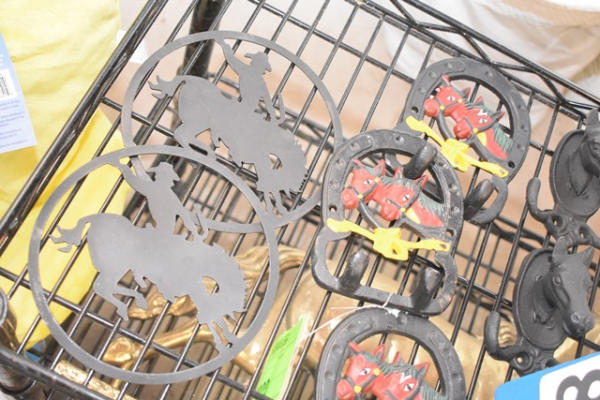 Lot of 2 horse head bridle hooks, 3 misc. horseshoe shaped hooks and 2 cowboy bucking cutouts