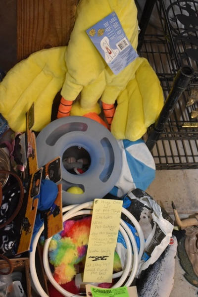 Large lot consisting of food dishes, pet toys, animal costumes, leather leads, cat and dog toys, stainless steel feeding bowls, small fleece pet bed