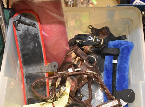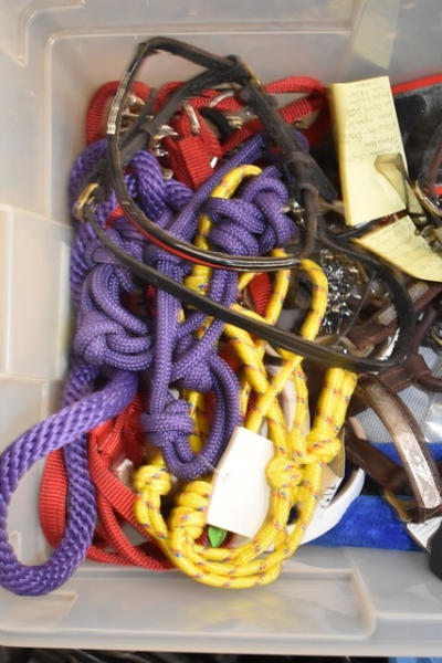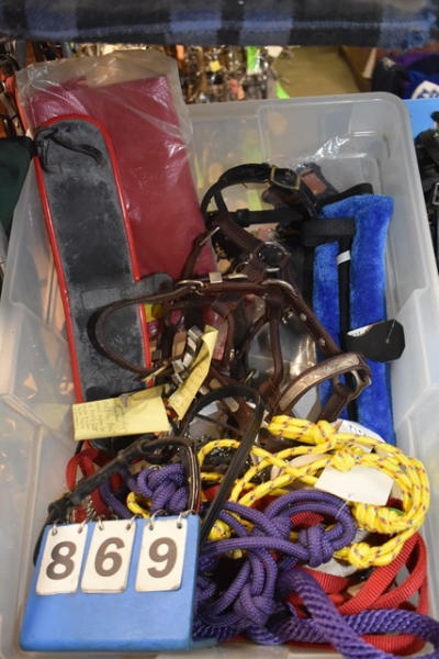 Box lot of tack including 2 pairs of hobbles, leather back pad, new fleece back pad, white Beta leads, western lead, show halter, 2 silver chains, etc.