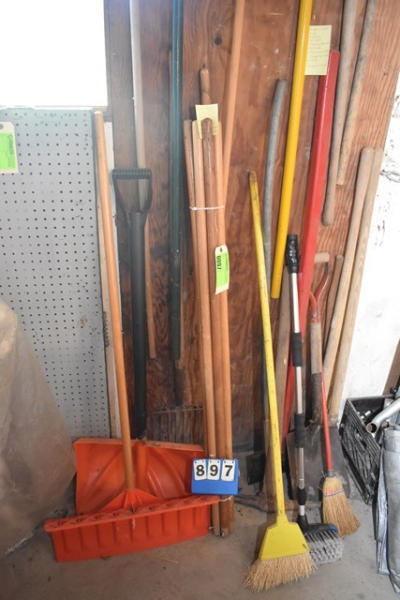 Lot consisting of hoe, rake, wire brush, minnow landing net, shovels, etc.