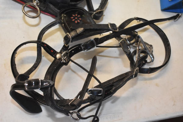 Patent leather show harness with red trim, fits large A or small B mini, 32" - 36", patent leather traces and bits with 2-tone lines, breast collar, breast collar has hold loop for martingale (not included)