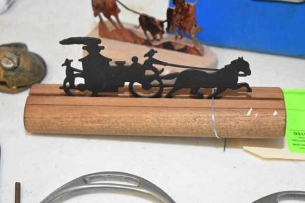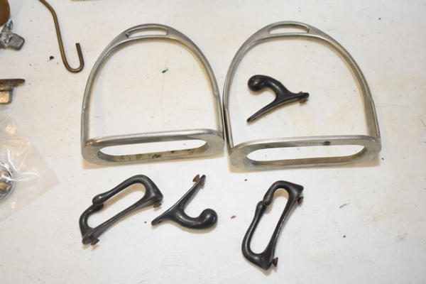 Toddler English stirrups, brass chin bumper, pair of cross conchos, roping rodeo silhouette, weight tape, garder straps, brass cart stops