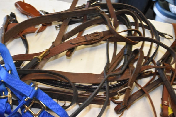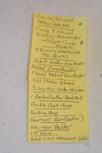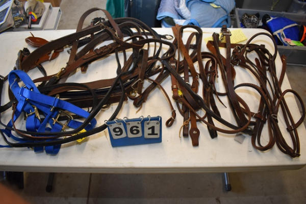 #961 – Circle Y rolled show halter, Circle Y raised scallop breast collar with silver conchos accents, 4 running martingale tie downs, patent leather breast collar, padded breast collar, floral tooled breast collar, new slobber straps, 3 1-ear leather wood brow band leather head stall, buckle check pieces, bucking strap, gaming rein, leather, new nylon halter, tie down, back cinch, attachment leather