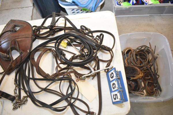 #965 – Lot of 2 complete western pony bridles, 2 back cinch straps, 2 sets of English stirrup irons, throat line head bumper, chain lead, nylon breast collar, black split reins, martingale tie down, pony split reins, lunge line, brow band, cavesson 1-ear bridle headstall, harness leather reins, brush, misc. straps and rope