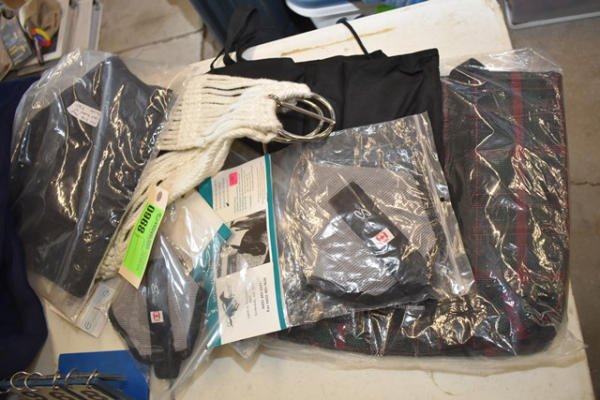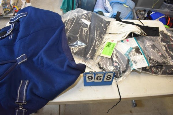 Lot consisting of all new items including mini high neck fleece cooler, medium neck sweat mini, 2 new fly masks, 2 mini girths, 2 grooming bags
