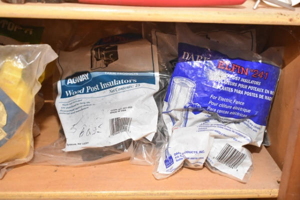 Cabinet contents consisting of fence pliers, gate handles, U-post insulators, T-post toppers, wood post insulators, safe fence corner insulators, etc.