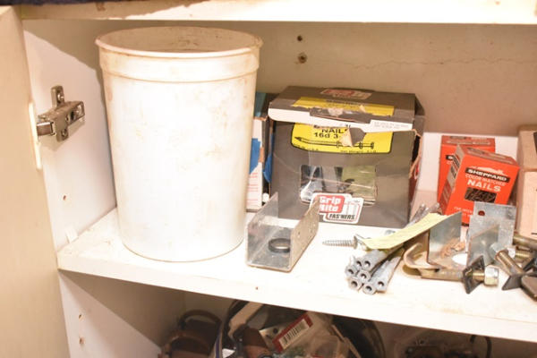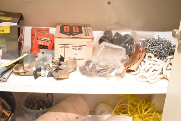 Contents of cabinet including wheel, hubs, PVC fence toppers, string, various chain boxes, tubs and nails, toggle bolts, etc.