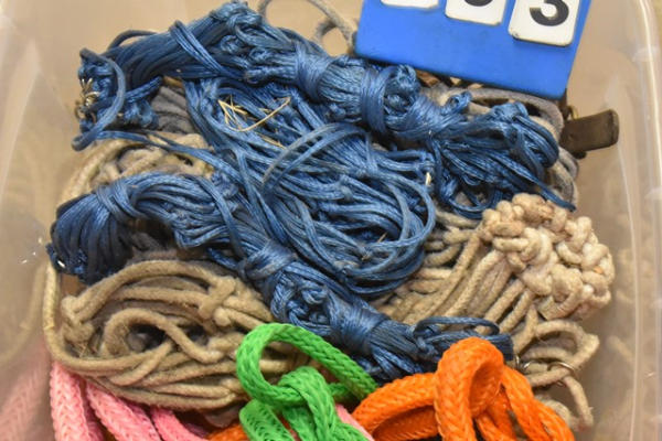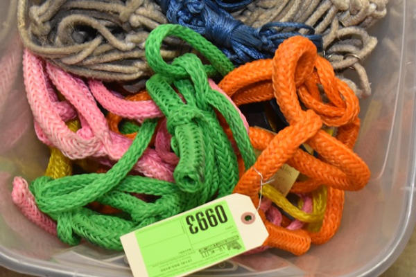 Lot of shipping halters, hay nets, 2 leather halters, 2 trailer ties, 1 short cotton lead