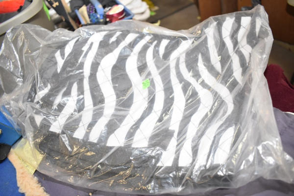 Mini zebra stripe English saddle pad, grazing muzzle and 1 pair of shipping boots