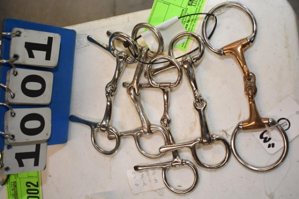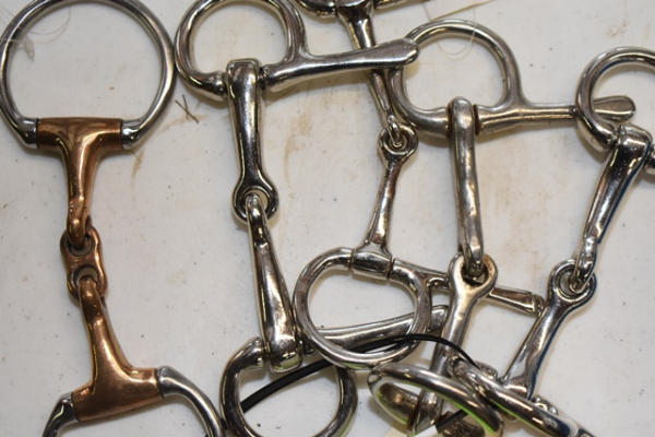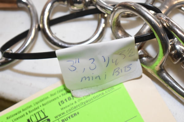 Lot of 5 3", 3 3/4", and 3 1/2" mini bits, spoon bits, French link D ring, snaffle