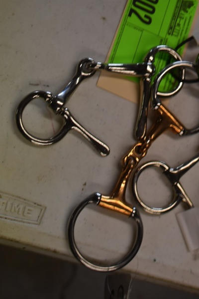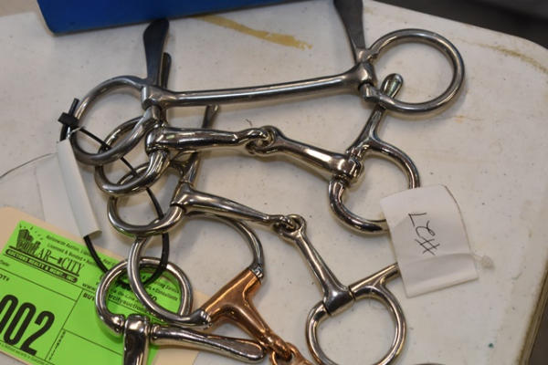 Lot of 5 3", 3 1/2", and 3 1/4" mini bits, French link D ring, straight mouth driving bit, and 3 spoon snaffle bits