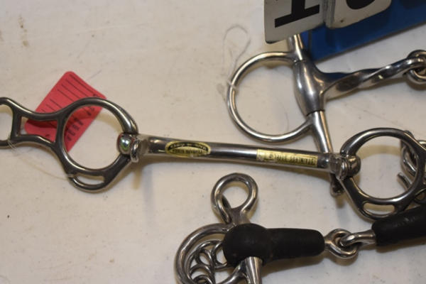 Lot of 5 4 1/4" pony bits including Crescendo and twisted bridle bit and a pelham bit