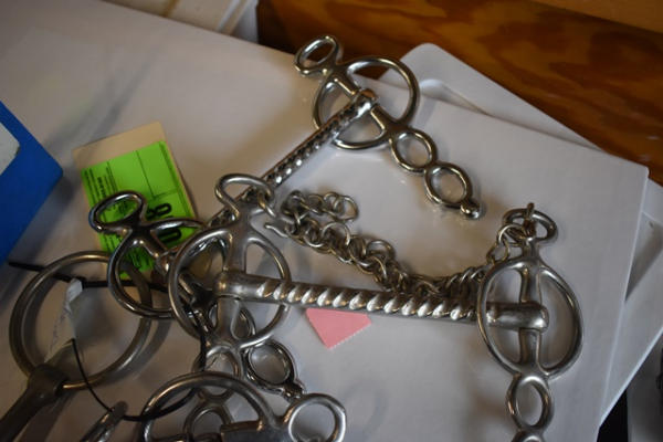 Lot of 5 6 1/2" and 6 1/4" draft horse bits including 3 different types of connections including western riding pelham, 3 driving bits and a straight bar English or Western bit