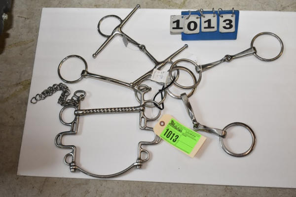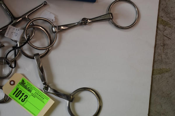 Lot of 6" and 6 1/4" bits including straight mouth bar, English full cheek snaffle, O-ring slow twist, O-ring loose ring, and a large draft horse bit with hard bar spacer