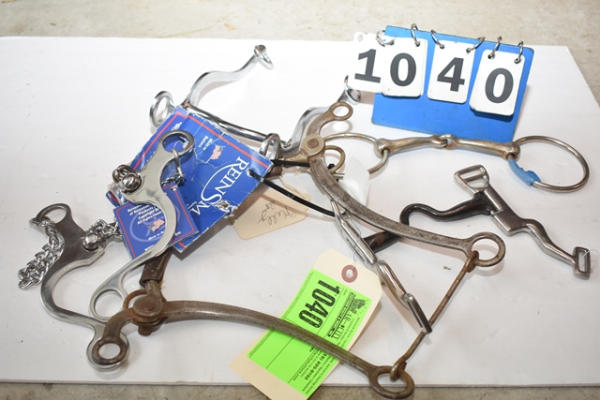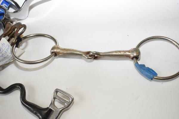 Lot of 5 bits including Leather covered hackamore, Reinsman new chain flyer, grazing bit, Sweet Iron grazing bit and an O-ring snaffle