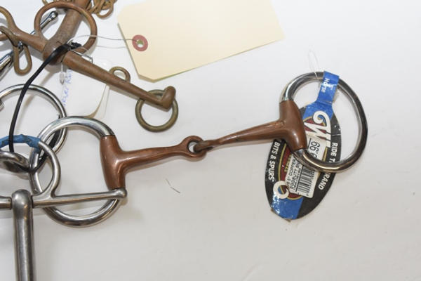 Lot of 5 5" bits including a copper Pelham, snaffle with a straight mouth (smooth on one side, rippled on the second side), fat mouth Pelham straight bar, copper roller and a New Shires foamer bit