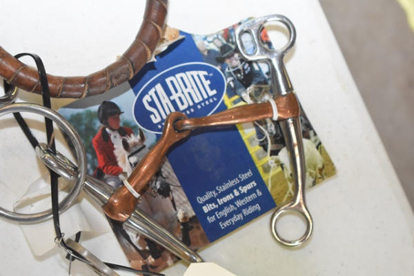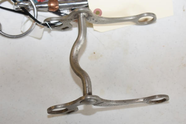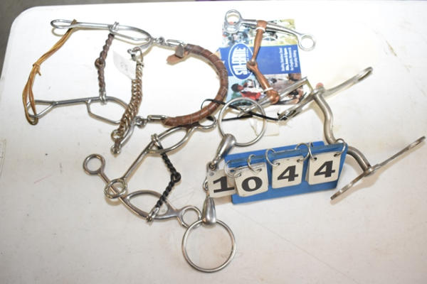 Lot of 5 bits including an aluminum engraved on the side shank grazing bit, French link dog bone loose ring snaffle, sweet iron mouth slider cow horse bit, a copper roller sweet iron mouth hackamore and a copper Tom Thumb