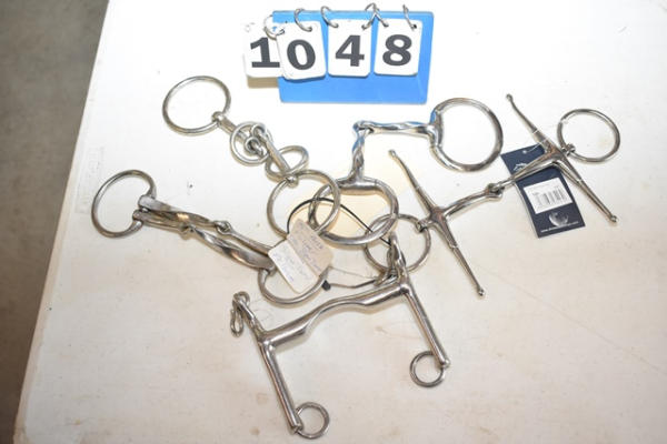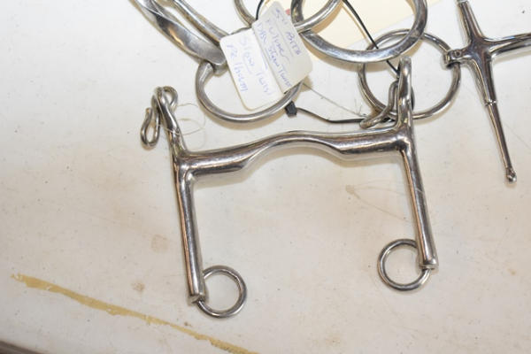 Lot of 5 5" bits including a new Shires foamer, double twist slow twist egg butt snaffle, straight mouth Pelham, slow twist snaffle and an English double ring driving bit with large O-ring for reins and small O-ring for check bit