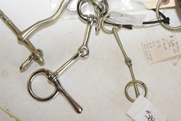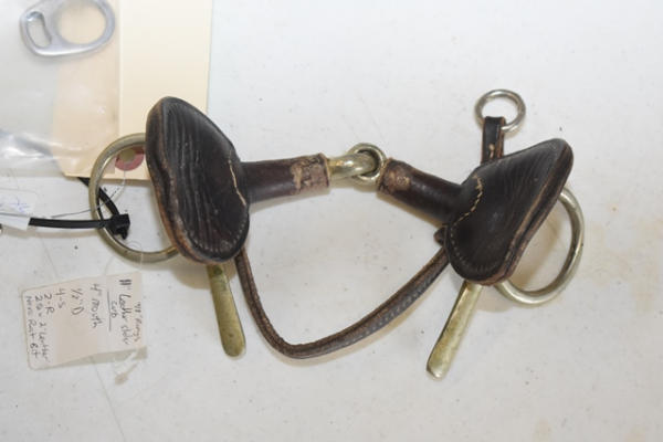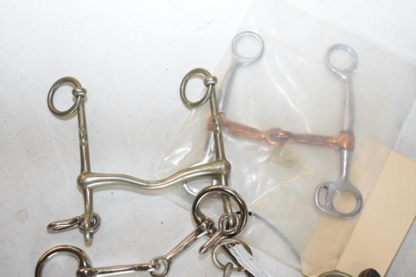 Lot of 5 4" bits including a Never Rust leather covered mouth piece with bit guard, a spoon bit for driving, jointed over check, Pelham with a low port and a copper mouth Tom Thumb snaffle bit